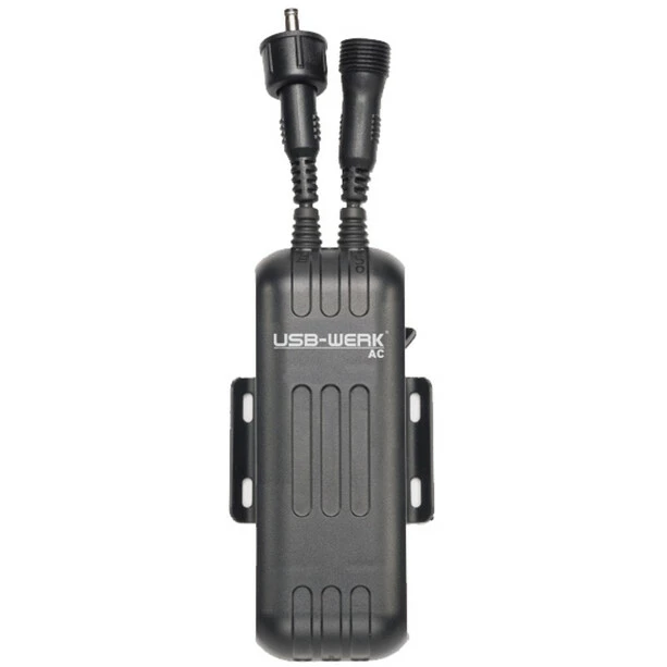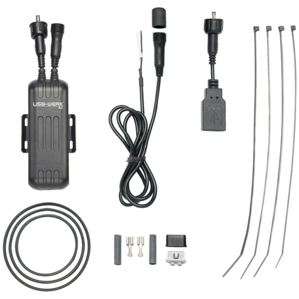 Das USB-WERK wird am Nabendynamo angeschlossen und macht die Energie nutzbar, indem es 5 V Spannung und bis zu 500 mA Stromstärke abgibt. Ein integrierter, kleiner Pufferakku stellt sicher, dass auch bei langsamer Fahrt und kurzen Stopps die Spannungsversorgung konstant bei 5 V bleibt. Das USB-WERK ist damit bestens geeignet zum Laden/Betreiben von USB-Geräten aller Art: Mobiltelefon, GPS, MP3-Player etc. Enthält Ausgangskabel mit USB-Buchse.