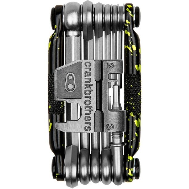 Klein, handlich, funktional und limitiert: Das Multi-17 von Crankbrothers in schwarz ist ein Fahrrad-Multitool mit 17 Werkzeugen aus 6150 High-Tensil Stahl. Am Multi-17 findet ihr viele verschiedene Sechskant-, dazu einen Schlitz- und Kreuzschraubenzieher, Speichen- und Maulschlüssel, Torx 25 und einen Kettennieter, welcher sogar gerissene Ketten wieder verschließen kann.