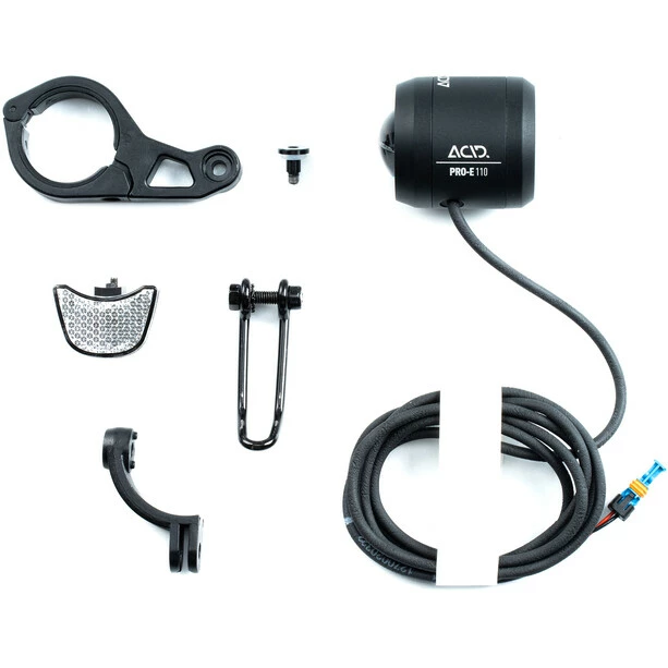 Spot an für das ACID E-Bike Frontlicht PRO-E 110! Für herausragende Ausleuchtung sowohl im Straßenverkehr als auch im Gelände sorgt die Linse mit MTi Technology und lässt das leistungsstarke Licht mit 110 Lux und 550 Lumen in die Dunkelheit strahlen. Mit dem 130 cm langen Lichtkabel mit Stecker für BOSCH Motoren ist der Anschluss am E-Bike ein absolutes Kinderspiel. Inklusive Lenkerhalter für 31,8 und 35 mm Durchmesser, GoPro-kompatiblem Universaladapter und Gabelhalter für flexible Montage.