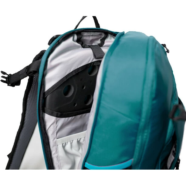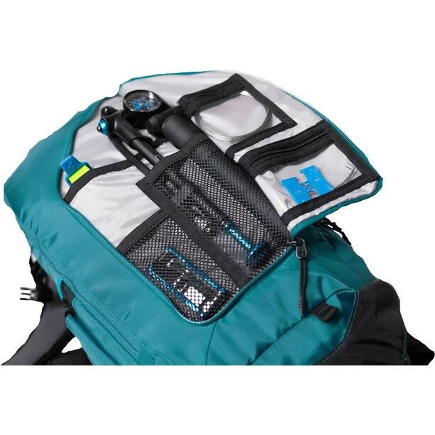 Perfektes Timing, die Wolkendecke reißt auf und die Sonne strahlt durch die Baumkronen am Einstieg meines Lieblings-Trails. Am Anfang zieht er noch flowig durch den Fichtenwald aber weiter unten wird er technisch und steil. Im Fall der Fälle sind Ersatzschlauch und Pumpe leicht zugänglichen im perfekt organisierten Werkzeugfach. Und dann der fiese Drop an der Schlüsselstelle. Ein gutes Gefühl zu wissen, dass mein Rücken durch den integrierten SAS-Tec Protektor optimal geschützt ist.
