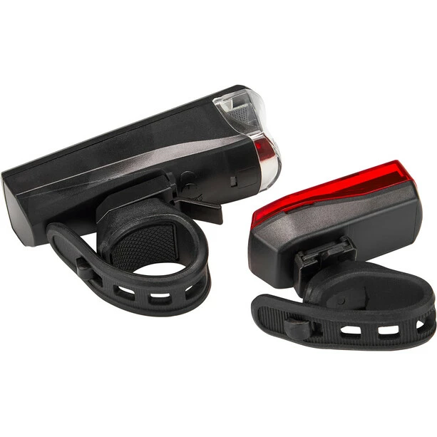 Das batteriebetriebene LED-Frontlicht mit 20 Lux wird per hochwertigem Halter am Lenker angebracht. Dieser ist winkelverstellbar und ermöglicht so eine individuelle Einstellung. Das passende LED-Rücklicht mit 2-stufigem Batterieindikator wird mit einem Silikonband befestigt. Beide Lichter sind auch bei feuchten Witterungsverhältnissen dank Spritzwasserschutz einsetzbar und natürlich StVZO zugelassen.