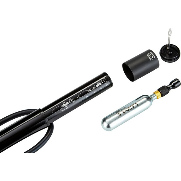 Die CNC Tubeless Drive ist eine innovative 3-in-1-Mountainbike-Handpumpe, die für die das Aufpumpen sowie die Reparatur großvolumiger schlauchloser Reifen entwickelt wurde. Das kompakte System kombiniert ein Reparaturset für schlauchlose Reifen, einen CO2-Inflator und eine großvolumige Handpumpe – alles bequem in einer leichten, maschinell bearbeiteten Aluminiumkonstruktion untergebracht. Dies ermöglicht eine schnelle Reparatur vor Ort. Der lange Schlauch, der überlappende Griff und das großvolumige Design ermöglichen ein effizientes Aufpumpen mit bis zu 2 BAR (30 PSI). Das Spannfutter ist schlauchlos-spezifisch und „klappt“ für Presta oder einen Presta-Gewindeschaft mit Gewinde (bei entferntem Ventileinsatz), um beim Aufsetzen eines schlauchlosen Reifens für mehr Luftstrom zu sorgen. Und der CO2-Inflator ermöglicht ein sofortiges Aufpumpen und eine zusätzliche Sitzkraft für schlauchlose Reifen. Er ist mit fünf qualitativ hochwertigen und abdichtmittelfreundlichen Reifenstopfen und einer austauschbaren 20-Gramm-CO2-Kartusche ausgestattet.