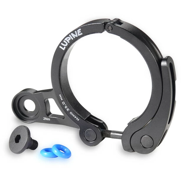 Lupine SL Nano Schnellspanner für die Montage an Stangen mit passendem Durchmesser. Er besteht aus CNC-gefrästem, schwarz eloxiertem Aluminium. Die Gummiauflage verhindert Kratzer und sorgt für festen Halt. Abstand vom Befestigungsloch der Halterschraube zum Halterrand ca. 15 mm, Schellenbreite 9 mm.