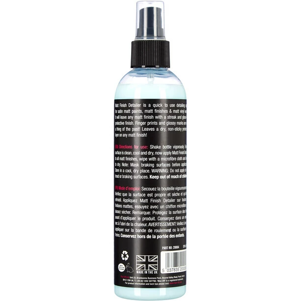 Der Matt Finish Detailer sorgt nach dem Reinigen für ein schützendes Finish. Biologisch abbaubar und speziell ausgelegt für matte Oberflächen, hinterlässt das Mittel eine schmutz- und wasserabweisende Schutzschicht auf Rahmen und Komponenten. Der Matt Finish Detailer ist ideal für den Winter geeignet, wenn durch Nässe und Straßensalz erhöhte Korrosionsgefahr besteht.