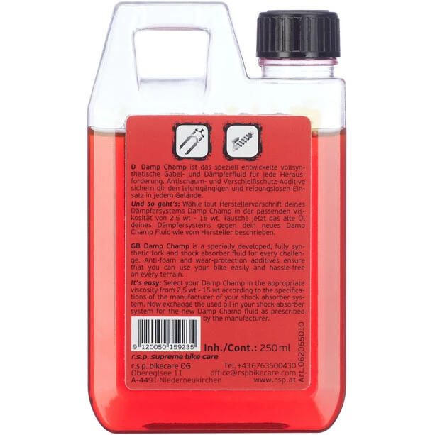 Und so geht’s: Wähle laut Herstellervorschrift deines Dämpfersystems Damp Champ in der passenden Viskosität von 2.5 WT – 15 WT. Tausche jetzt das alte Öl deines Dämpfersystems gegen dein neues Damp Champ Fluid wie vom Hersteller beschrieben. Erreiche das Maximum mit deinem Dämpfersystem und schmiere die vom Hersteller beschriebenen beweglichen Teile und Dichtungen mit r.s.p. Slick Kick.