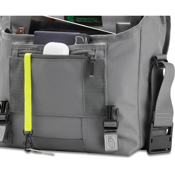 Die klassische Messenger Bag. Vor über 30 Jahren in San Francisco entworfen und mit modernen Upgrades verbessert. Der gebogene Schultergurt verfügt über ein gekrümmtes Airmesh-Gurtpolster für mehr Komfort, strapazierfähiges Gurtband und die Double-Loop CAM-Schnalle von Timbuk2 zur schnellen Einstellung und zur Vermeidung baumelnder Riemen. Die SR-Schnallen sind teilweise hinter der Überschlagklappe verborgen und sorgen für einen raffinierten, aber sicheren Verschluss. Im Inneren halten das wasserdichte TPU-Futter und die Eckflügel das Wasser draußen und das interne Wasserflaschenfach das Wasser drinnen. Die verteilten Innentaschen und die Organisation sorgen für eine ausgewogene Verteilung des Tragegewichts. Der abnehmbare Schultergurt stabilisiert die Tasche ab der Größe Small. Wasserabweisende Außenbeschichtung für Schutz bei leichtem Regen.