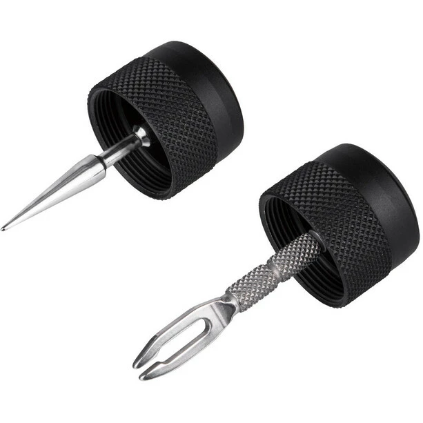Das Tubeless-Reparaturset der Minimalisten. Enthält einen Air-Stop, Plug-Einstecher, Aufreiber und drei 3,5 mm dicke Plugs, die in einem Transportfach gelagert sind. Die Tubeless-Tools sind in den Endkappen integriert, wobei die profilierte Oberfläche für maximalen Grip während der Reifenreparatur sorgt.