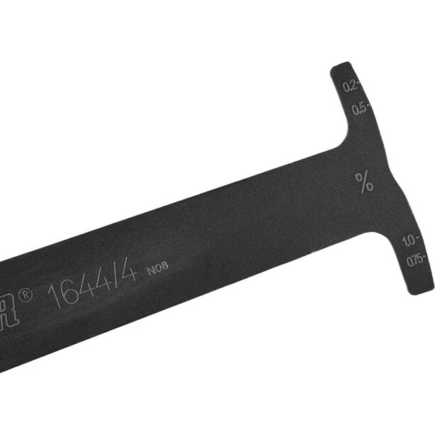 Mit der Lehre kann man ganz einfach und schnell den Verschleiß der Kette vermessen. Der Verschleiß wird mit Messwinkeln der Lehre festgestellt, die zwischen die Glieder der Kette eingesetzt werden. Die Lehre ist zum Vermessen von 10 Gliedern der Kette vorgesehen. Messvorgang an verschiedenen Segmenten der Kette wiederholen.