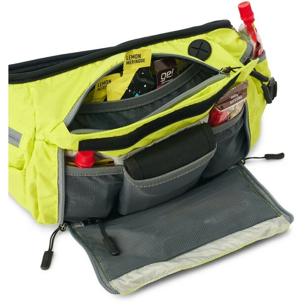 Mit einer Gesamtkapazität von 6 Litern wird der Zulo mit einer 1,5-Liter-Hydrapak-Blase geliefert. Der Zulo hat eine große zentrale Tasche, einen Raum mit mehreren Fächern und 2 Reißverschlusstaschen an den Seiten, um deine Gele, Riegel oder anderes aufzubewahren. Sowohl vorne als auch hinten lassen sich zudem LED-Leuchten anbringen, die besonders praktisch bei wenig Licht sind.
