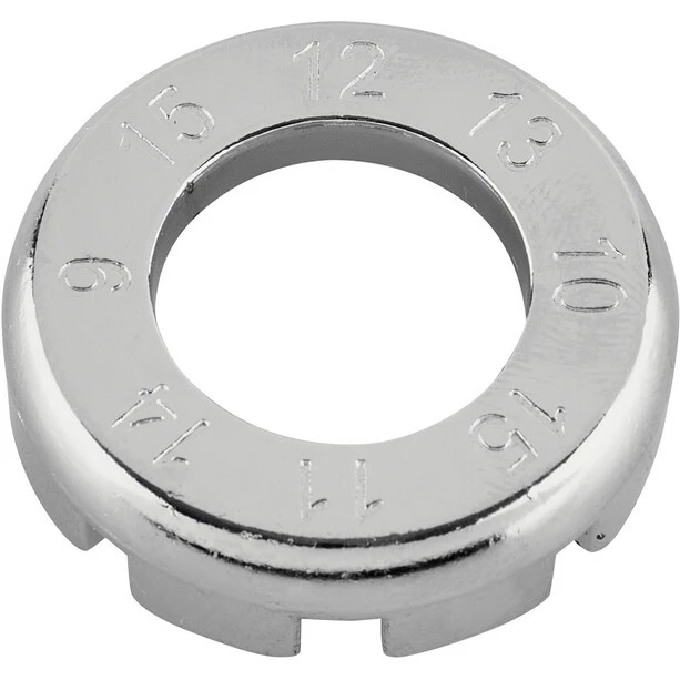 Ein universeller XLC Speichenschlüssel in Tellerform für verschiedene Nippeldurchmesser.